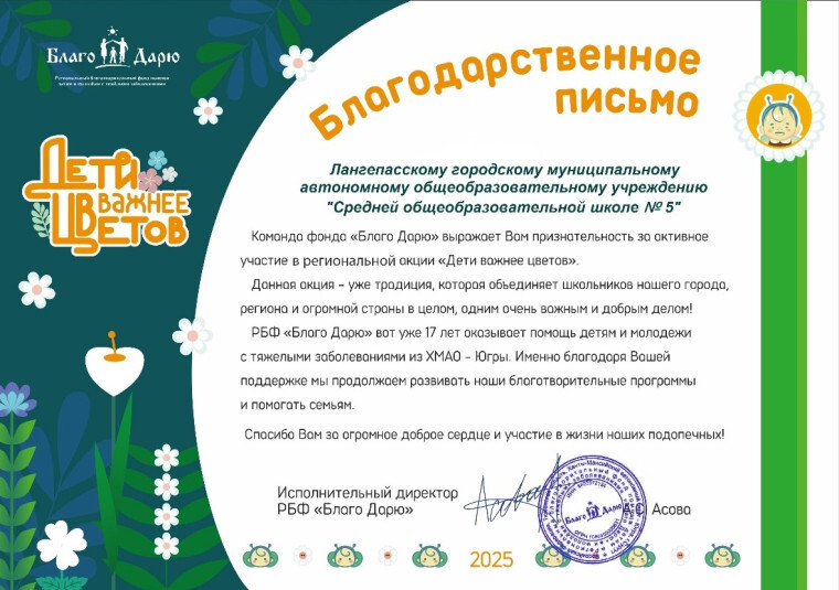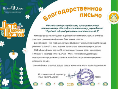 В первых числах сентября родительские коллективы ЛГ МАОУ «СОШ №5» и педагогический коллектив приняли участие в традиционной акции «Дети важнее цветов». В благотворительный фонд «Благо Дарю» города Сургута была перечислена сумма более 110.000 рублей. В этом году в акции поучаствовали 28 классов школы.